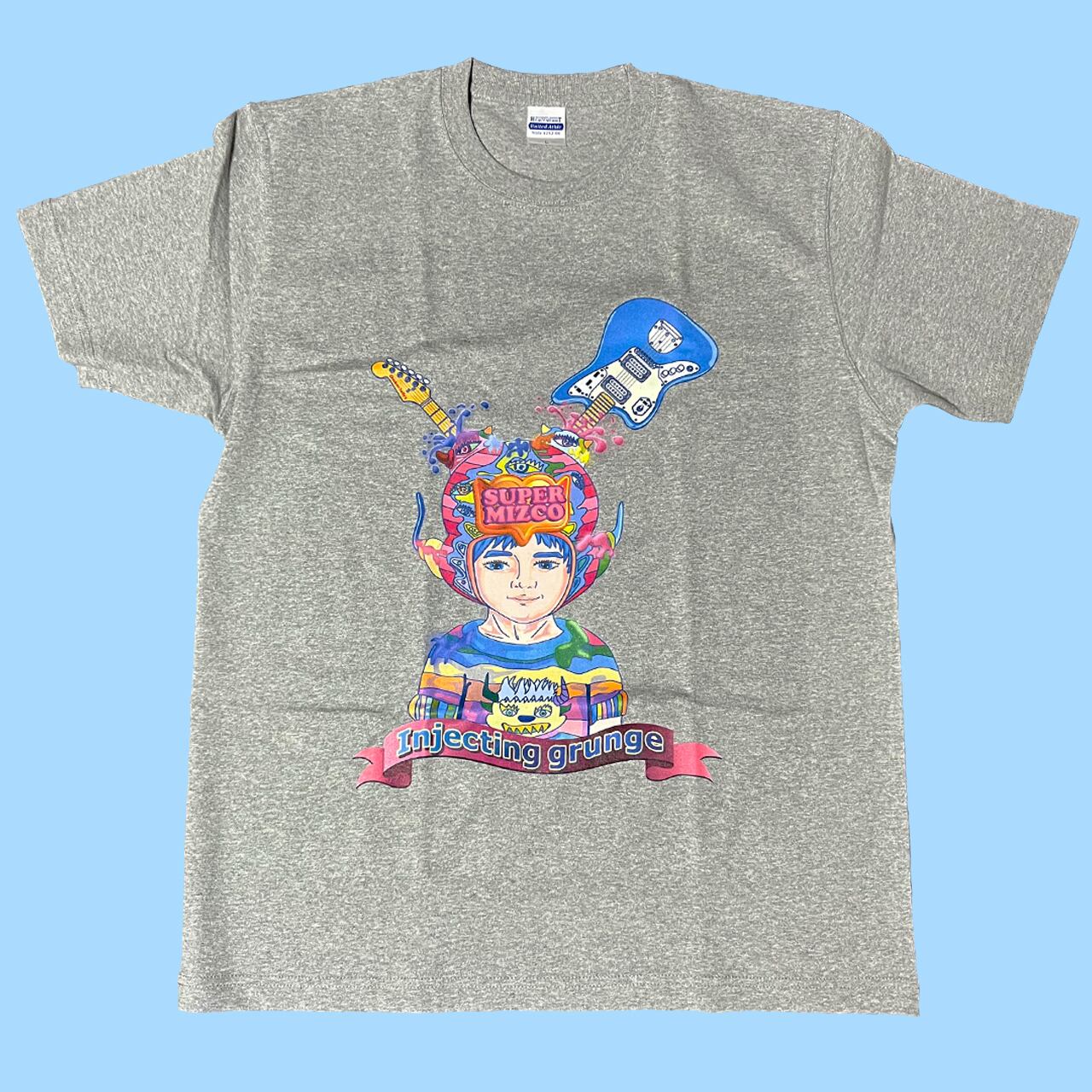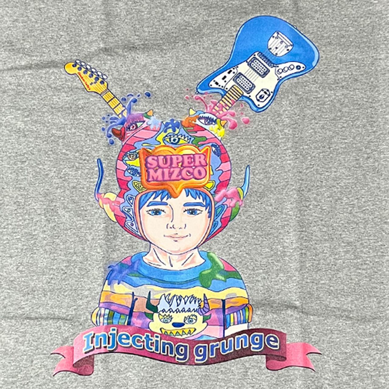 頭にはニルヴァーナのカート・コバーンが愛用したFender Jaguarを突き刺し、リボンの文字には「Injecting grunge(グランジ注入中)」としました。